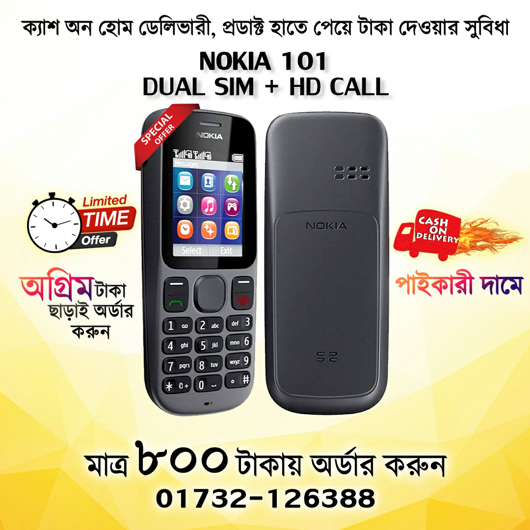 নোকিয়া ১০১ দুই সিম ও মেমোরী কার্ড ব্যবহার করা যায়। এই মোবাইল এর বিশেষত্ব হচ্ছে এটিতে ক্যমেরা নেই এবং এটি অত্যন্ত চিকন বা চ্যাপ্টা একটি বার ফোন।